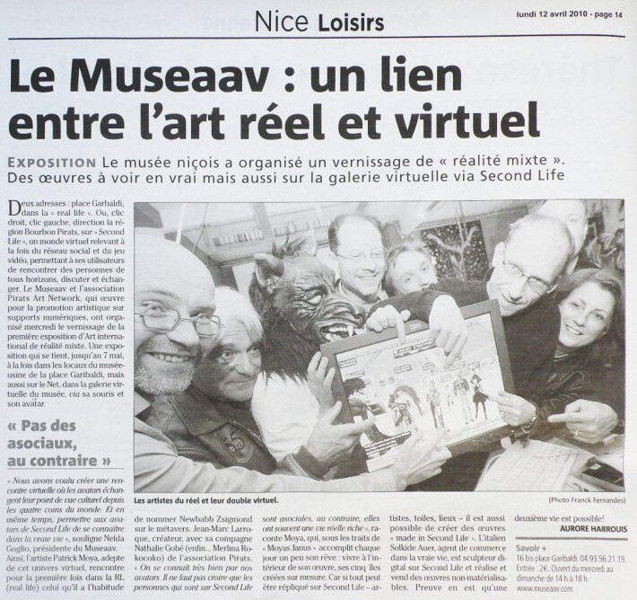 From April 7 to May 7, 2010, visitors could explore the exhibition both at the Museaav in Nice and within Second Life, featuring ten international artists: